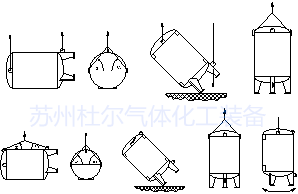 ①.按起吊說明圖將頂部吊耳和腿部吊耳用繩索(臥罐采用貯罐頂部吊耳,如沒設置吊耳,則可利用鞍座外側采用兜底吊)系住。