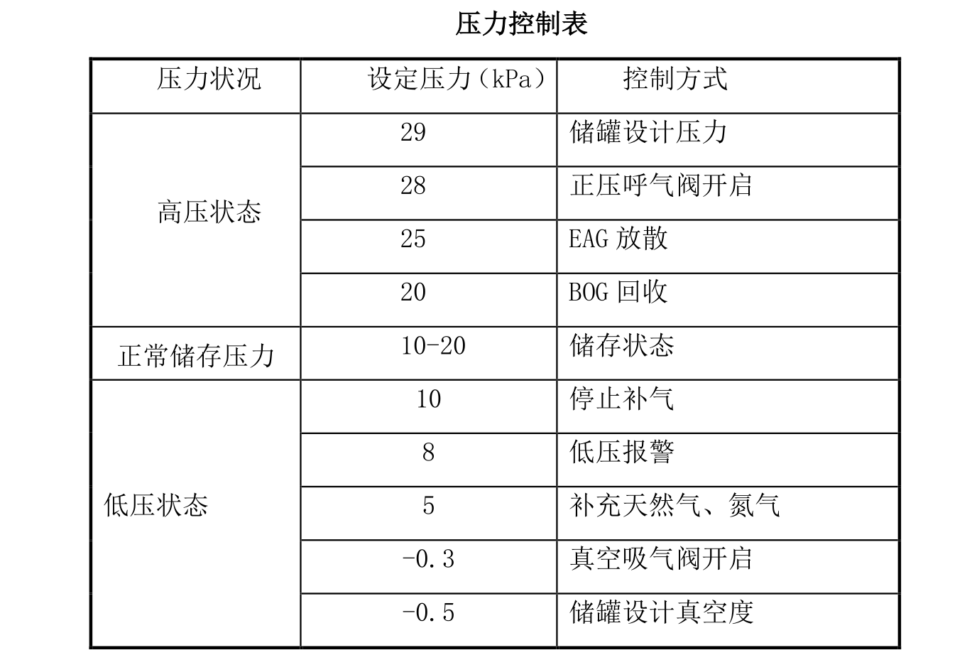 防止儲罐壓力過低的安全保護順序:1)減少 BOG 管線回收的氣體量;2)向罐內充天然氣或氮氣;3)儲罐吸氣閥向罐內補充空氣。